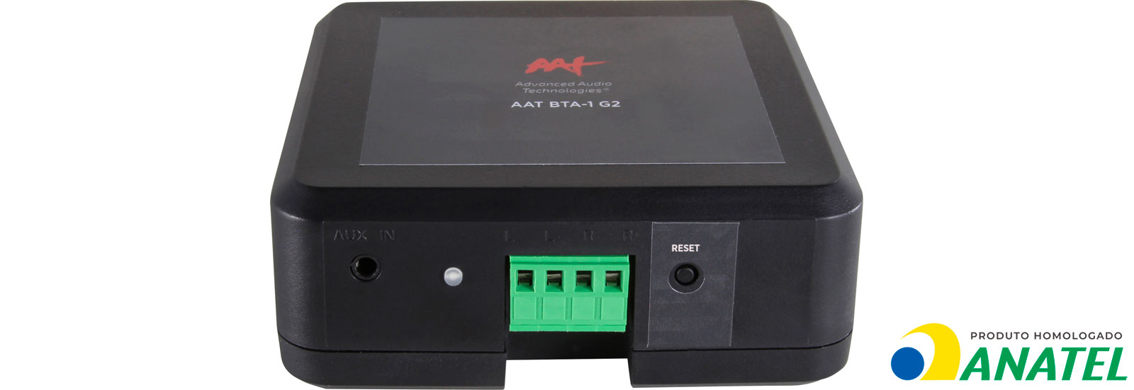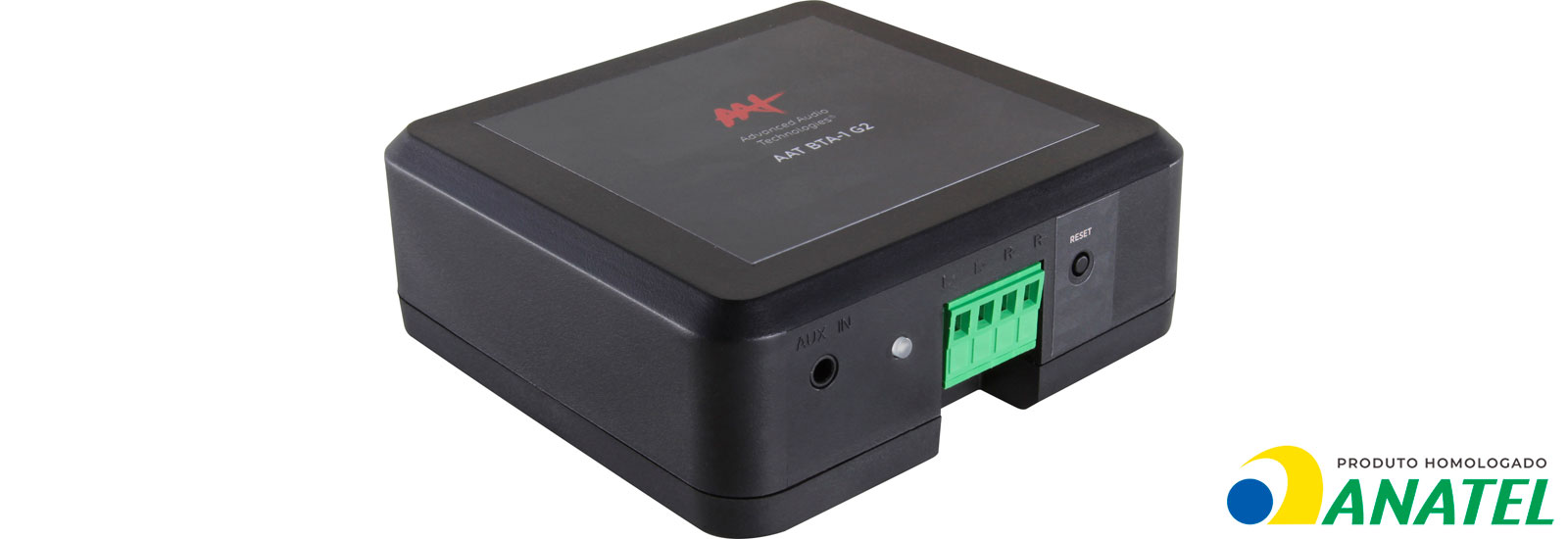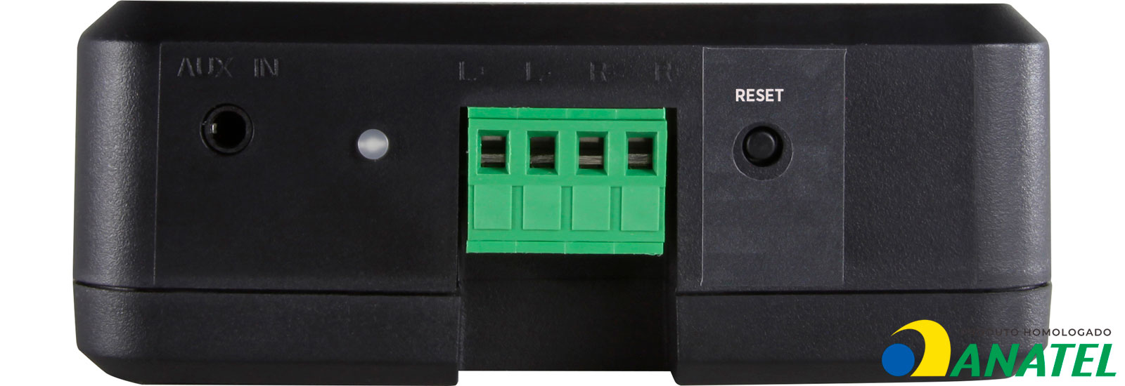 Amplificador Bluetooth Estéreo Compacto. Possui receptor Bluetooth V5.0, entrada auxiliar P2 (ativa quando o Bluetooth está desconectado) e fonte chaveada full-range automática de 90 a 255V. Pode ser instalado oculto em forros de gesso ou exposto. Inclui LED indicador de status, entrada auxiliar P2, saídas para alto-falantes e botão de reset. O controle de volume e seleção de músicas é feito pelo próprio celular via Bluetooth ou pelo televisor conectado.