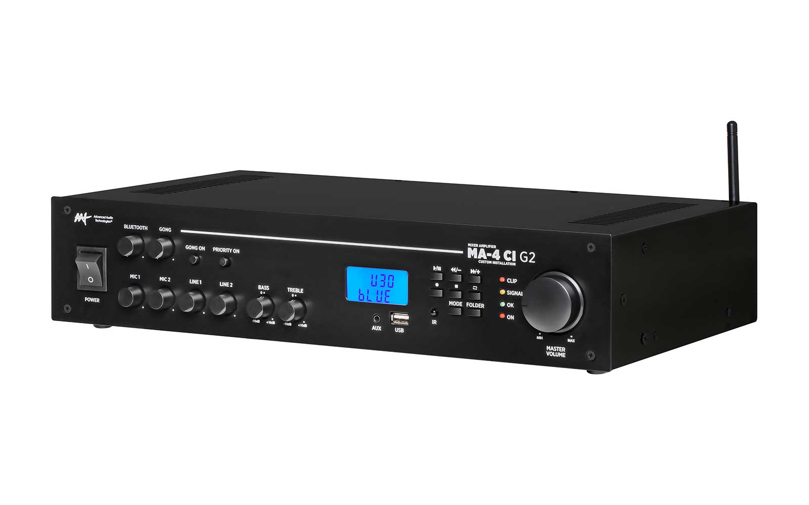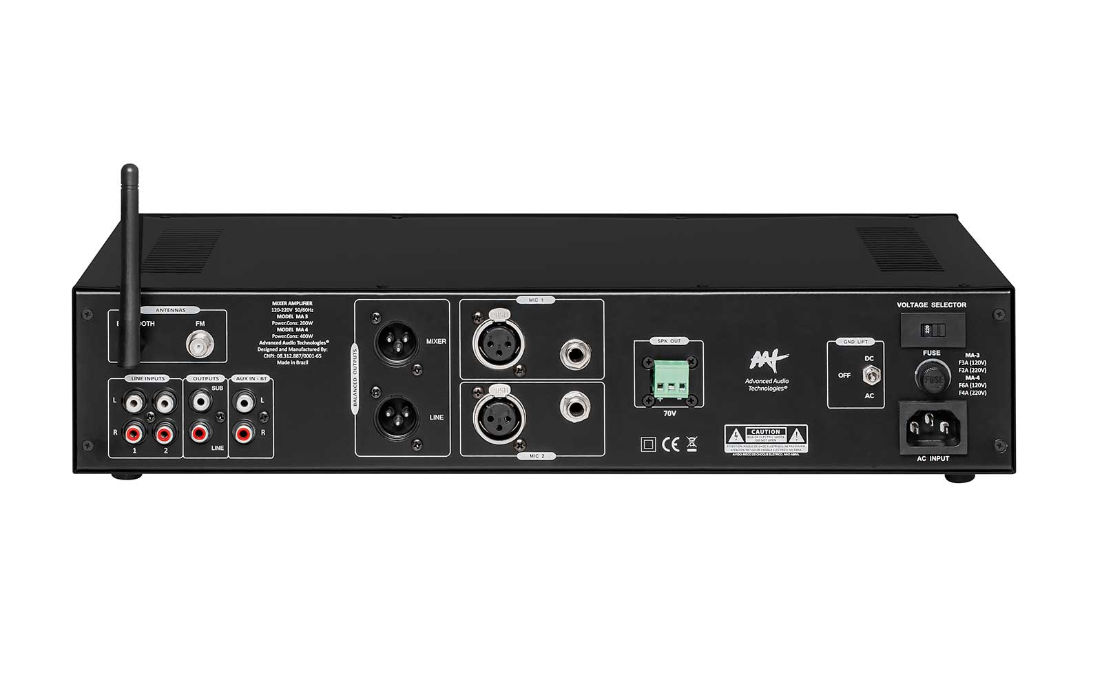 Mixer Amplificado 70V Mono. Conta com 2 entradas para microfones dinâmicos, 2 entradas de linha, entrada AUX frontal, módulo Bluetooth melhorado, entrada para pen drive, Rádio FM, gerador de gongo, controle remoto e tecla de gravação. Ideal para sonorização de ambientes comerciais em linha de 70V, como escritórios, clínicas, lojas e supermercados de pequeno ou médio porte.