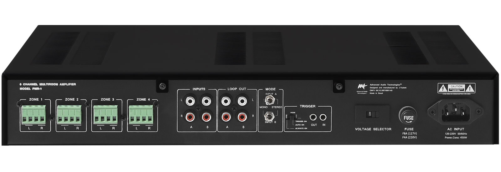 Amplificador Multiroom Analógico de 4 Zonas. Projetado para sonorizar até 4 espaços (8 canais) independentes. Possui 2 entradas analógicas que podem ser chaveadas para mono ou estéreo, além de funções Auto ON e Trigger ON para automação. Permite controle individual de volume, equalização e seleção de fonte diretamente no painel frontal.