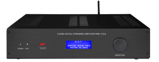 Amplificador Multiroom Digital de 2 Zonas com Streaming. Projetado para sonorizar até 2 espaços (4 canais), o PMR-13 possui 4 entradas analógicas, 1 digital (óptica/coaxial) e 1 streamer Wi-Fi (com LAN cabeado), além de saídas dedicadas para subwoofer e controle via Trigger In/Out. Fonte bi-volt automática e tecnologia antirruído.