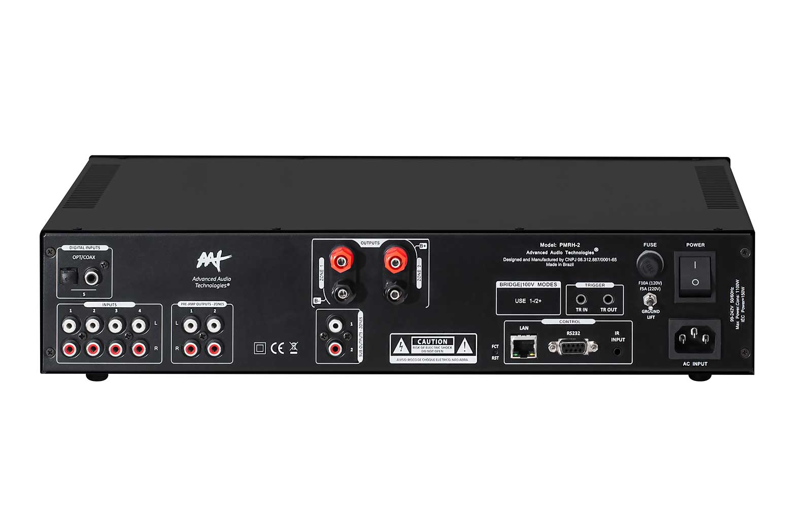 Amplificador Multiroom Digital de 2 Zonas (High Power). Conta com 4 entradas analógicas e 1 digital (óptica/coaxial), saídas para subwoofer e controle via Trigger IN/OUT, TCP, Serial, APP e IR. Ideal para grandes ambientes.