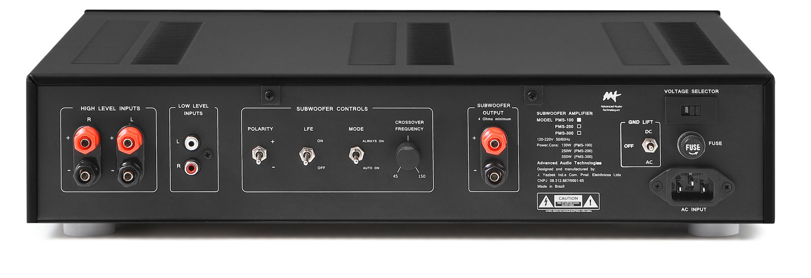 Referência no mercado, a linha de amplificadores para subwoofer da AAT utiliza as mais modernas tecnologias. Conta com sistema Auto ON, que liga o equipamento automaticamente com o sinal de áudio, voltando para a condição de espera (stand-by) após 15 minutos sem sinal.