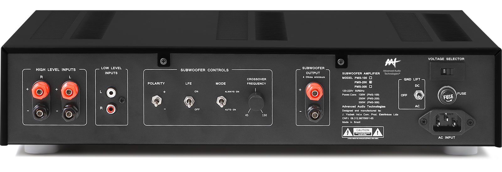 Referência no mercado, a linha de amplificadores para subwoofer da AAT utiliza as mais modernas tecnologias. Conta com sistema Auto ON, que liga o equipamento automaticamente com o sinal de áudio, voltando para a condição de espera (stand-by) após 15 minutos sem sinal.