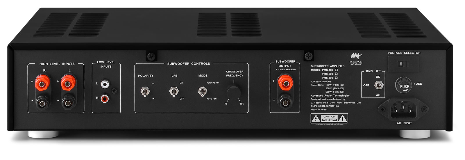 Referência no mercado, a linha de amplificadores para subwoofer da AAT utiliza as mais modernas tecnologias. Conta com sistema Auto ON, que liga o equipamento automaticamente com o sinal de áudio, voltando para a condição de espera (stand-by) após 15 minutos sem sinal.