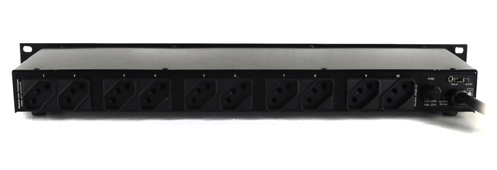 Extensor de tomada com 10 tomadas traseiras e 1 frontal, ideal para automação e integração de equipamentos em rack 19”. Entrada Trigger-In de 12V.