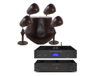 Kit com 4 caixas passivas, 1 subwoofer passivo, Amplificador de Subwoofer e Amplificador Multiroom de 2 zonas. Solução completa para som outdoor com alta fidelidade.